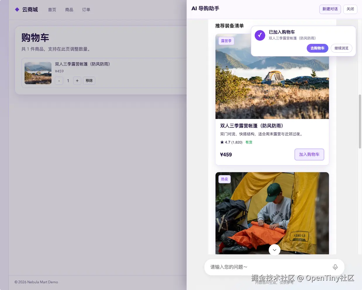 - 支持 AI 触发交互动作:加购、跳转商品详情、跳转购物车