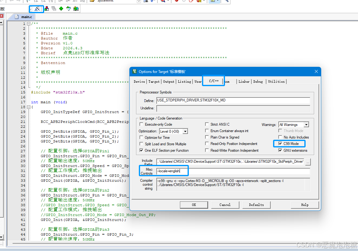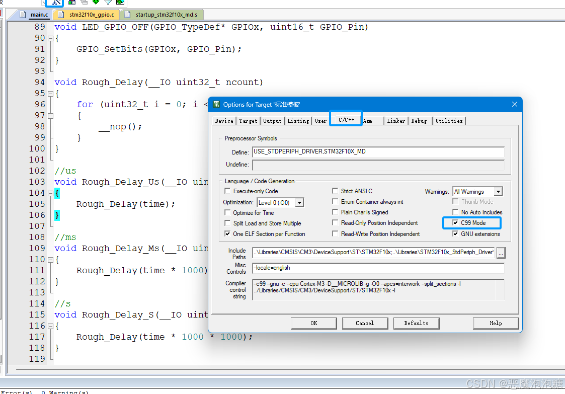 如果我们不勾选C99,像这种代码会直接报错,如果不是C99标准,就是我们在使用变量的时候,先要定义才能使用