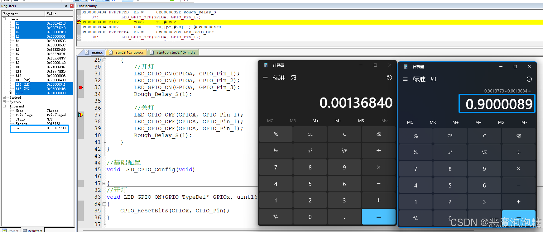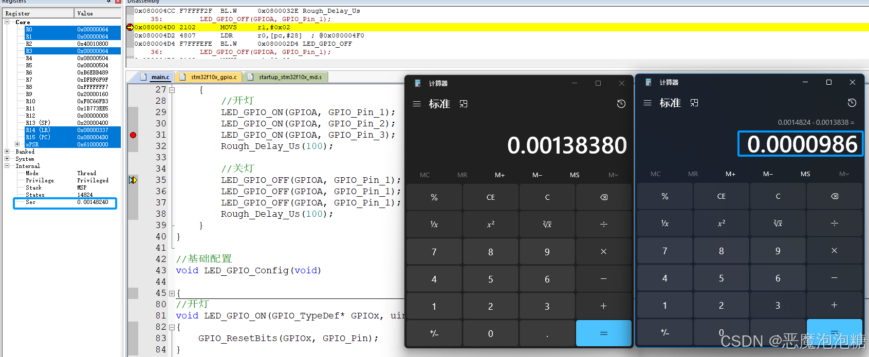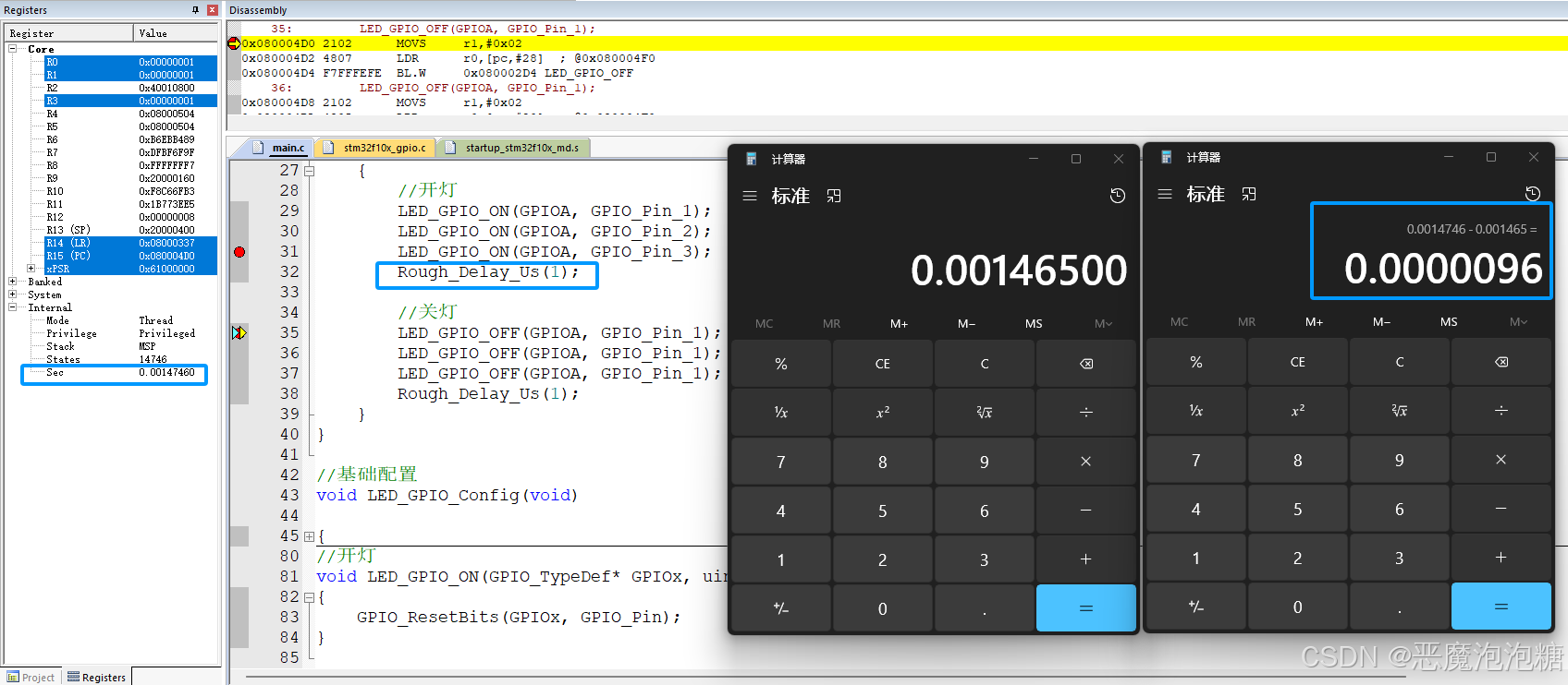 0.00146500s - 0.00147460s得到0.0000096s,大概就是9.6us,也就是说我在main函数那里调用us函数,1个us,大概执行的时间是9.6us