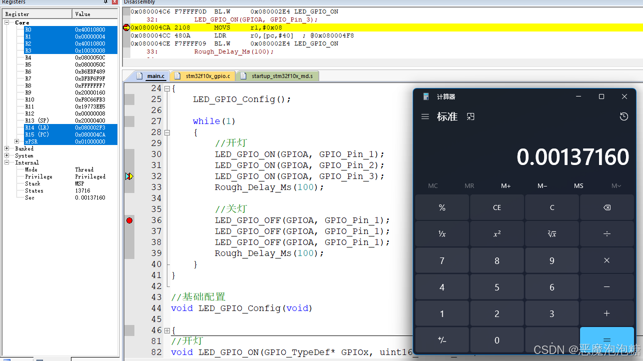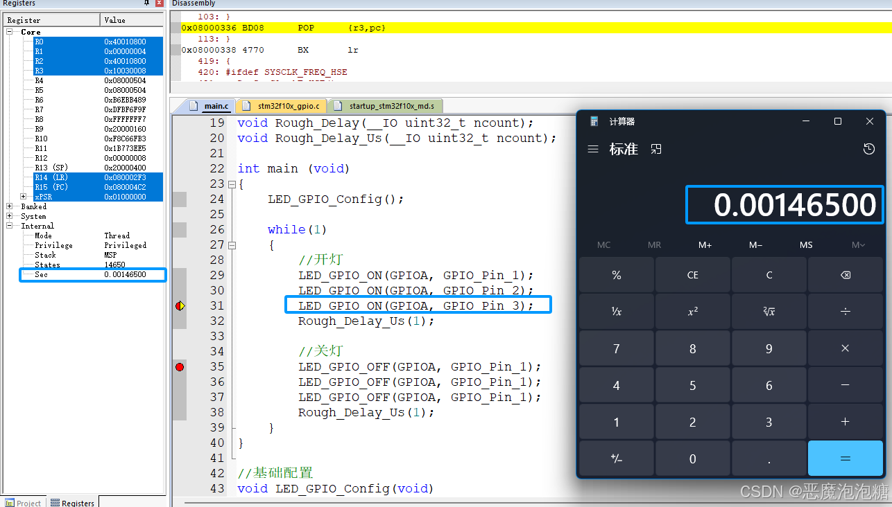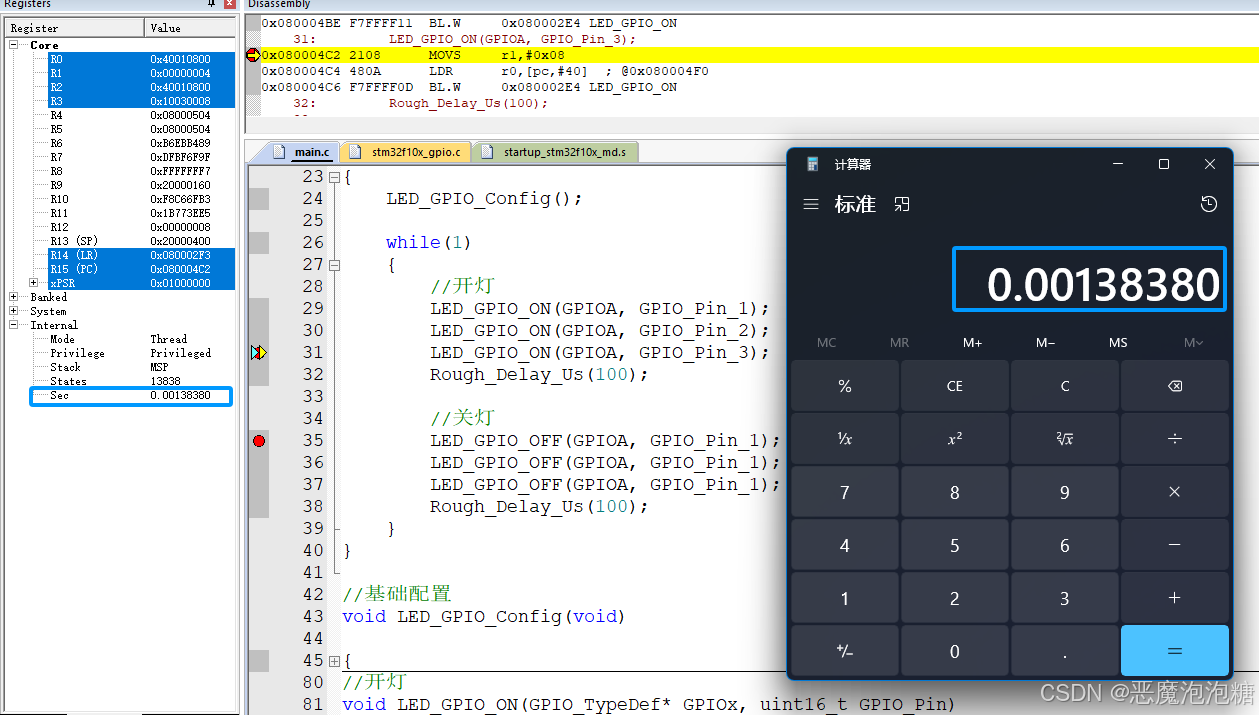 0.00146500s - 0.00147460s得到0.0000096s,大概就是9.6us,也就是说我在main函数那里调用us函数,1个us,大概执行的时间是9.6us