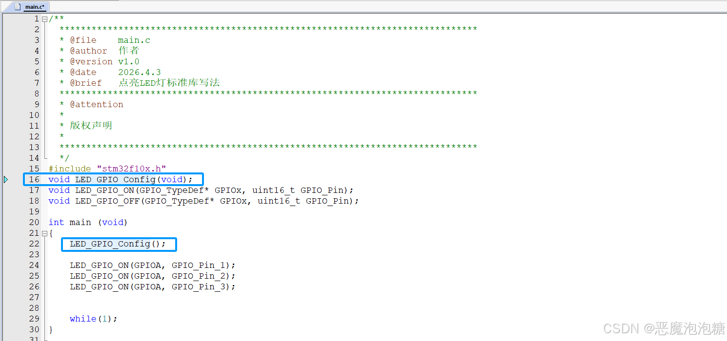 在main上面进行函数声明,以及在main里面进行函数调用,从而执行开灯和关灯的事情。