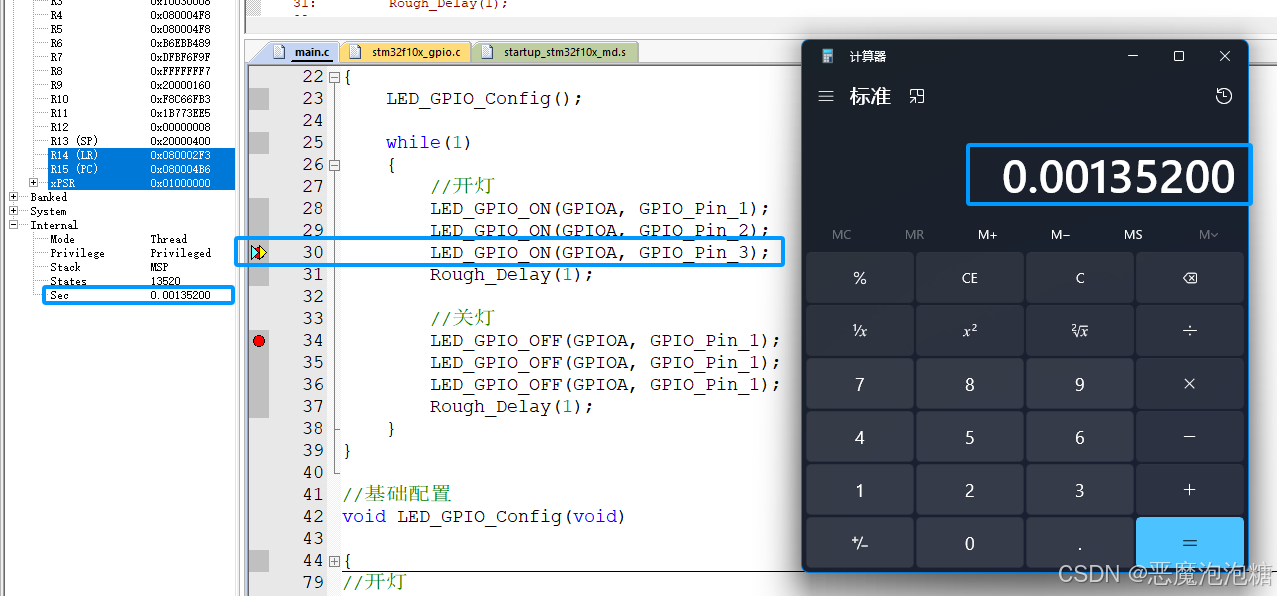通过Debug调试在延时上面一行语句执行的时间是0.00135200s,起始的时间