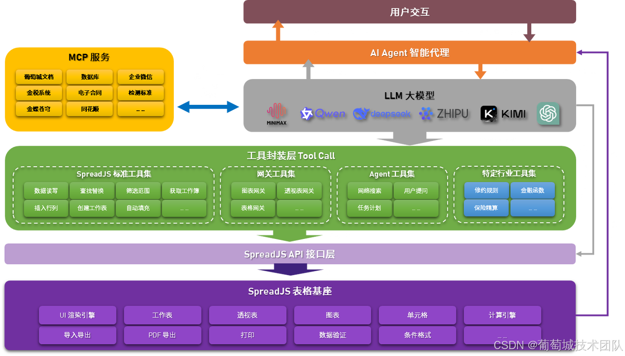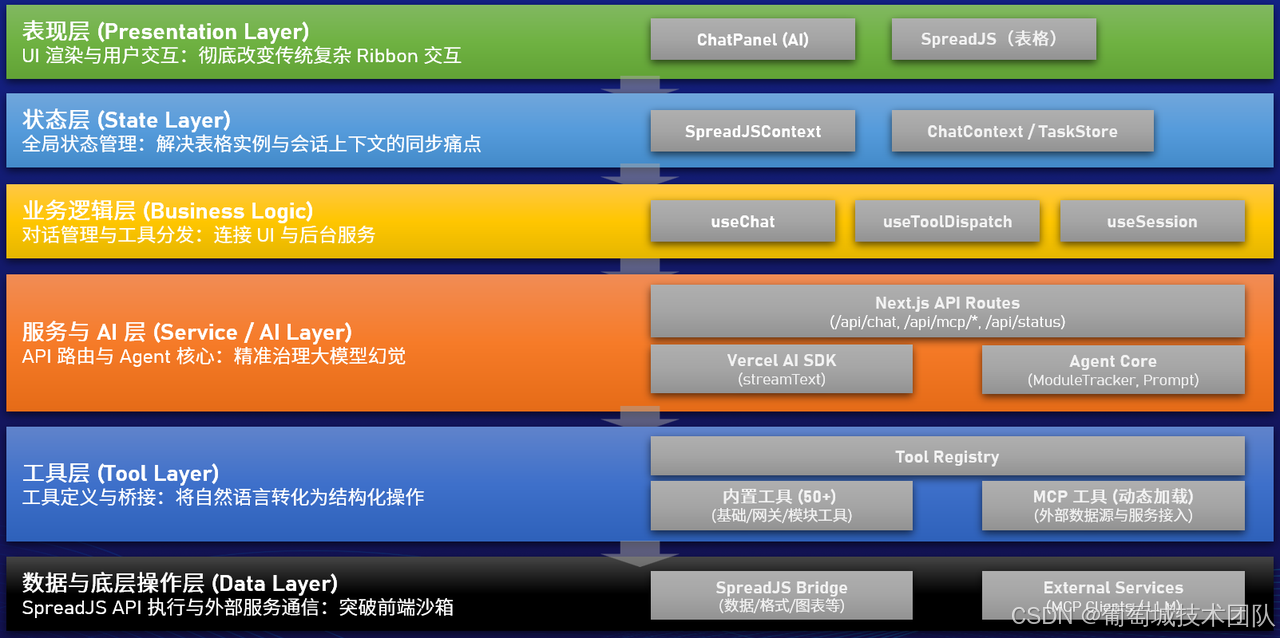 要将 AI 可靠地接入极其复杂的表格系统中,底层的架构设计至关重要。本次分论坛公开了 SpreadJS AI Agent 的六层核心架构,并详细拆解了其中的三大技术创新点: