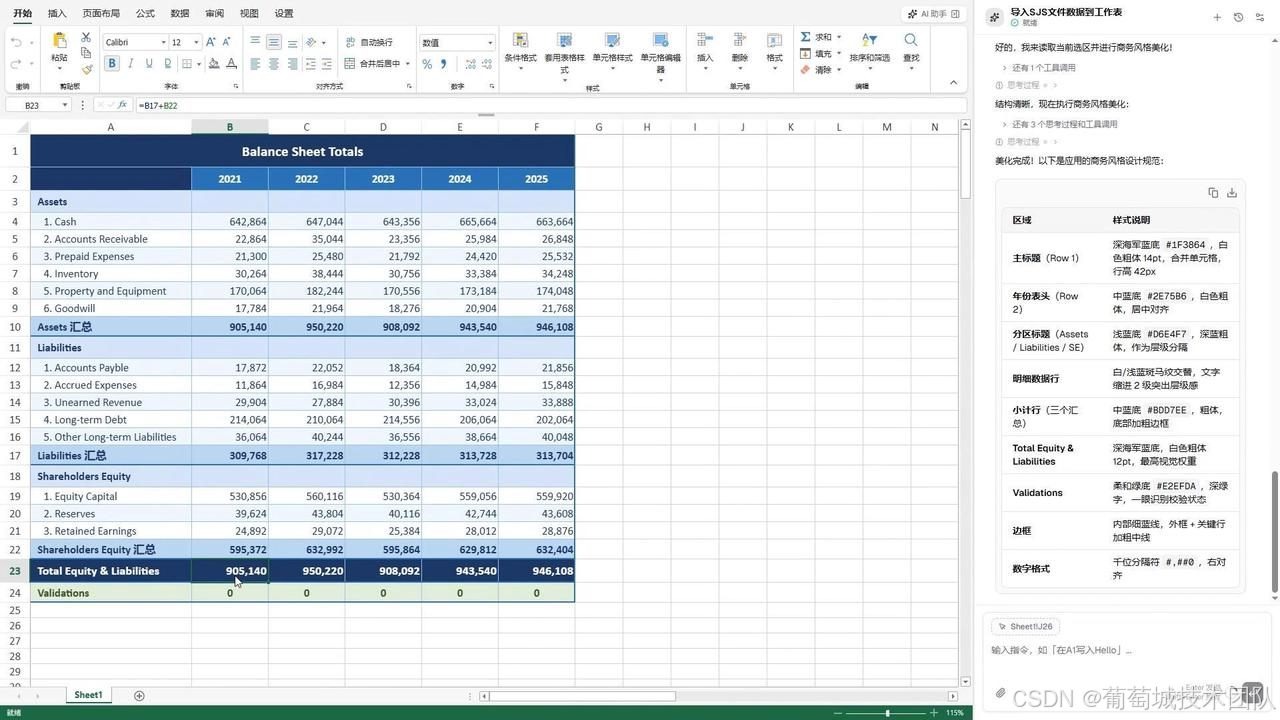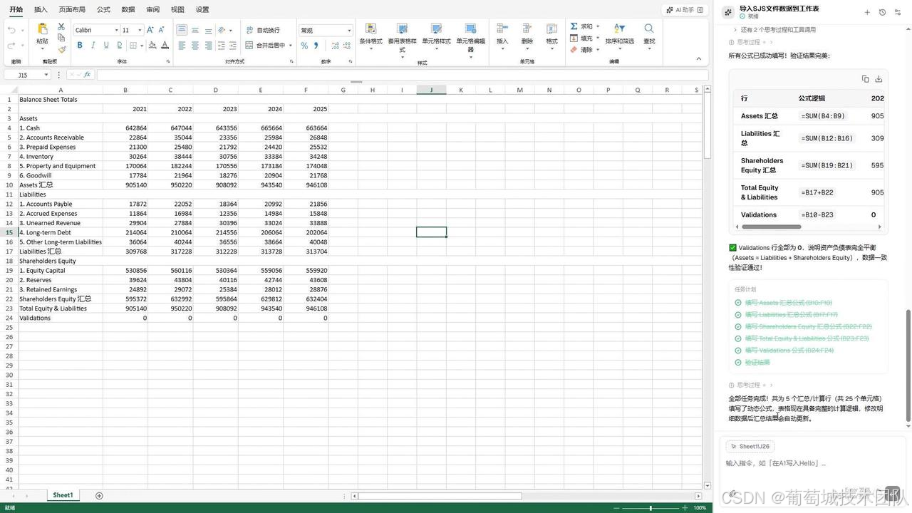 1.具备业务 Know-how 的数据理解 :AI 能够智能分析导入的报表结构。例如在处理资产负债表时,AI 不仅能自动生成汇总计算公式,还能执行如 Validations = 资产总计 - (负债合计 + 所有者权益合计) 的专业财务校验逻辑,确保底层计算逻辑的一致性与准确性。