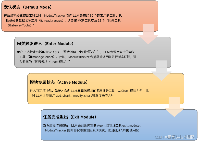 ModuleTracker依托于基于有限状态机 (FSM) 的动态路由系统:- 默认模式:仅向 LLM 暴露约 30 个最常用的基础数据读写工具和网关工具。