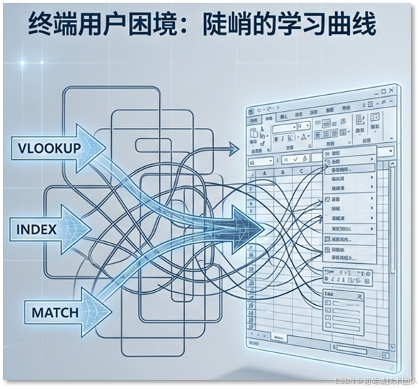 终端用户困境:陡峭的学习曲线 。传统的 Excel 交互繁杂且不够直观。对于非专业数据人员而言,诸如 VLOOKUP、INDEX、MATCH 等复杂函数和公式的学习成本极高,高级数据分析与报表美化更是存在难以跨越的技术门槛。