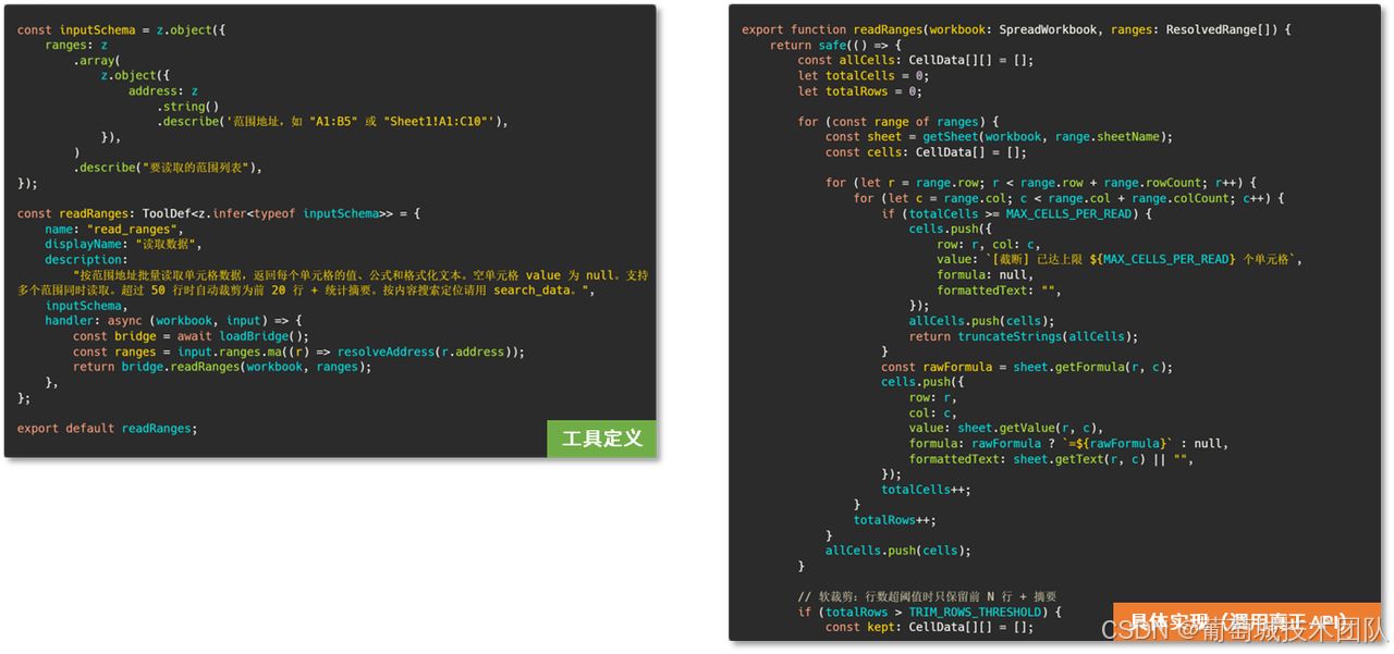 read_ranges、write_data、set_cell等基础原子工具,再结合网关工具和特定行业工具,以此保障极高的执行成功率和精细化的安全合规管控。