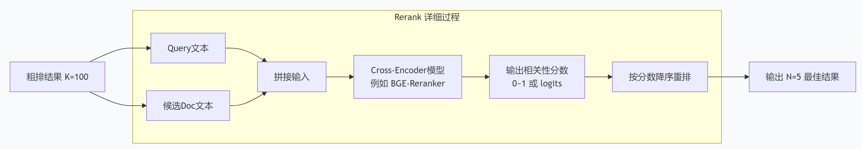 Rerank 模型(通常是交叉编码器,Cross-Encoder)对(Query, Document)对进行联合打分。