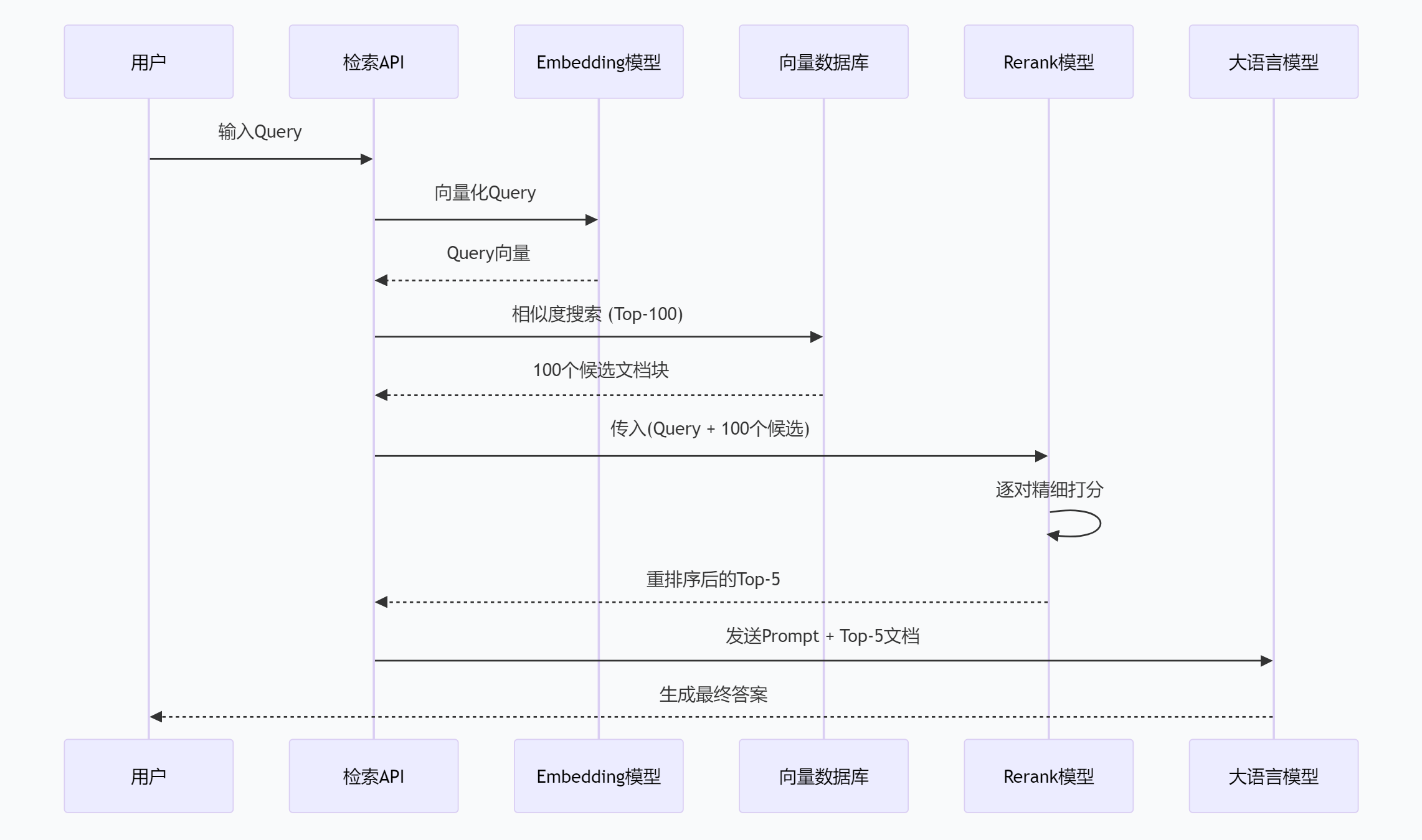 - 没有 Rerank:可能召回很多"貌似相关但实际无用"的内容,影响下游 LLM 生成质量。