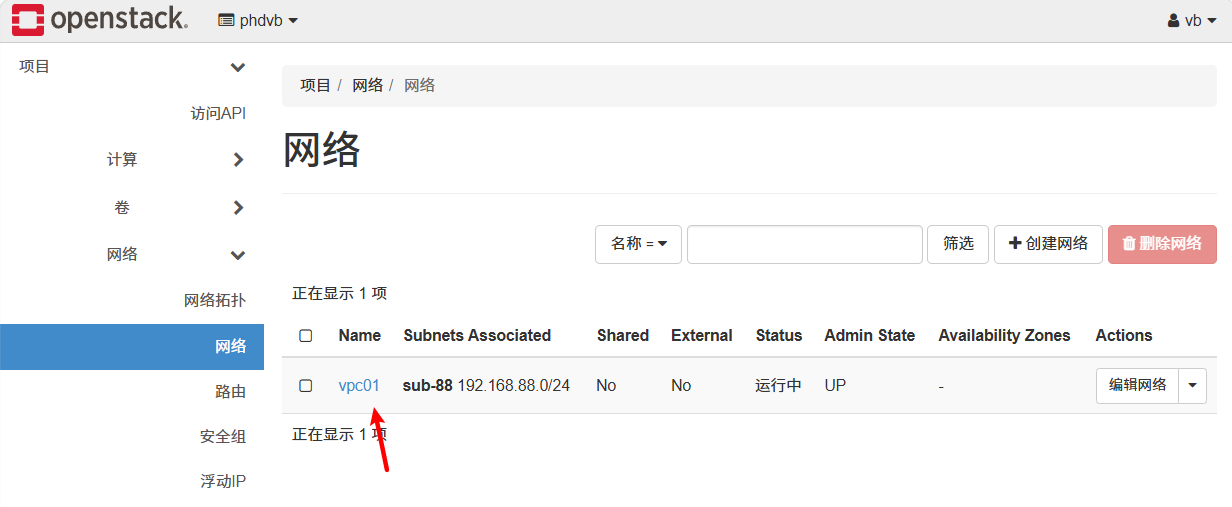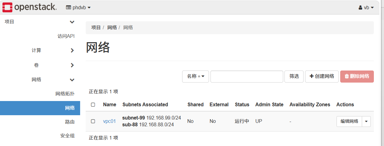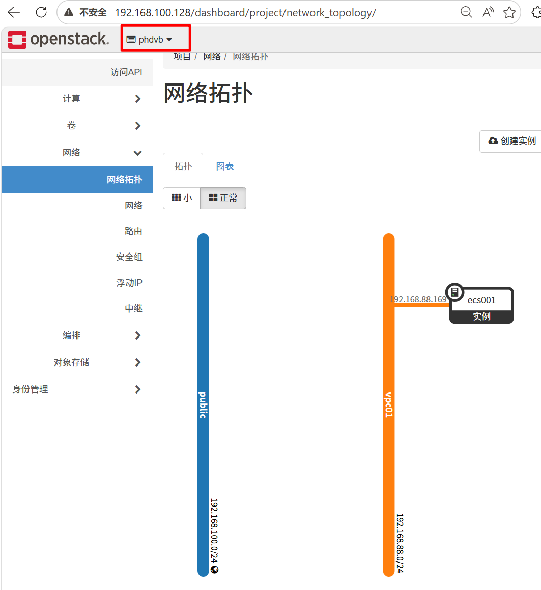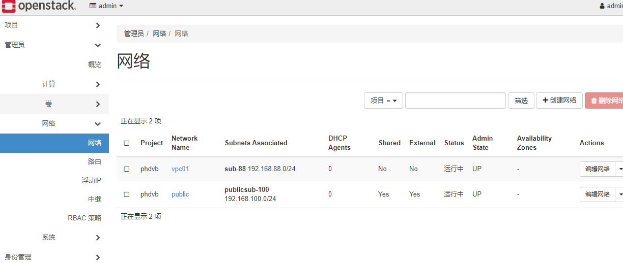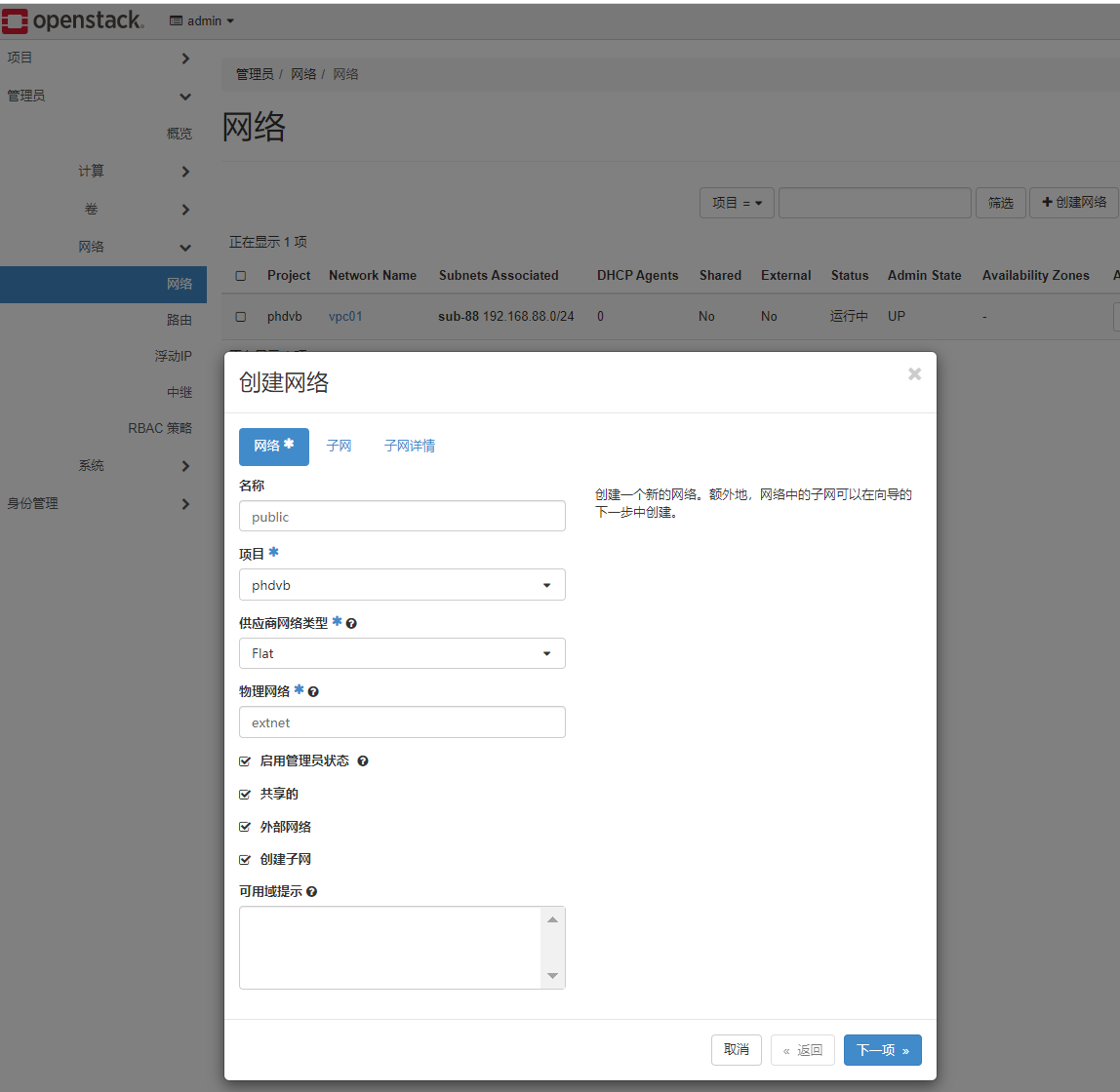 TypeScript[root@controller ~]# ifconfig br-ex: flags=4163<UP,BROADCAST,RUNNING,MULTICAST> mtu 1500 inet 192.168.100.128 netmask 255.255.255.0 broadcast 192.168.100.255 inet6 fe80::20c:29ff:feb1:47fc prefixlen 64 scopeid 0x20<link> ether 00:0c:29:b1:47:fc txqueuelen 1000 (Ethernet) RX packets 78129 bytes 219656760 (209.4 MiB) RX errors 0 dropped 0 overruns 0 frame 0 TX packets 57307 bytes 49891019 (47.5 MiB) TX errors 0 dropped 0 overruns 0 carrier 0 collisions 0 ens160: flags=4163<UP,BROADCAST,RUNNING,MULTICAST> mtu 1500 inet6 fe80::20c:29ff:feb1:47fc prefixlen 64 scopeid 0x20<link> ether 00:0c:29:b1:47:fc txqueuelen 1000 (Ethernet) RX packets 217594 bytes 243211439 (231.9 MiB) RX errors 0 dropped 0 overruns 0 frame 0 TX packets 83288 bytes 51521081 (49.1 MiB) TX errors 0 dropped 0 overruns 0 carrier 0 collisions 0 genev_sys_6081: flags=4163<UP,BROADCAST,RUNNING,MULTICAST> mtu 65000 inet6 fe80::ccce:ddff:fe9b:732c prefixlen 64 scopeid 0x20<link> ether ce:ce:dd:9b:73:2c txqueuelen 1000 (Ethernet) RX packets 0 bytes 0 (0.0 B) RX errors 0 dropped 0 overruns 0 frame 0 TX packets 0 bytes 0 (0.0 B) TX errors 0 dropped 15 overruns 0 carrier 0 collisions 0 lo: flags=73<UP,LOOPBACK,RUNNING> mtu 65536 inet 127.0.0.1 netmask 255.0.0.0 inet6 ::1 prefixlen 128 scopeid 0x10<host> loop txqueuelen 1000 (Local Loopback) RX packets 903488 bytes 227952976 (217.3 MiB) RX errors 0 dropped 0 overruns 0 frame 0 TX packets 903488 bytes 227952976 (217.3 MiB) TX errors 0 dropped 0 overruns 0 carrier 0 collisions 0管理员账号创建公网: