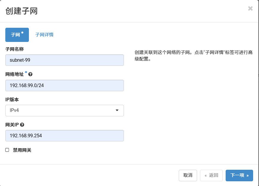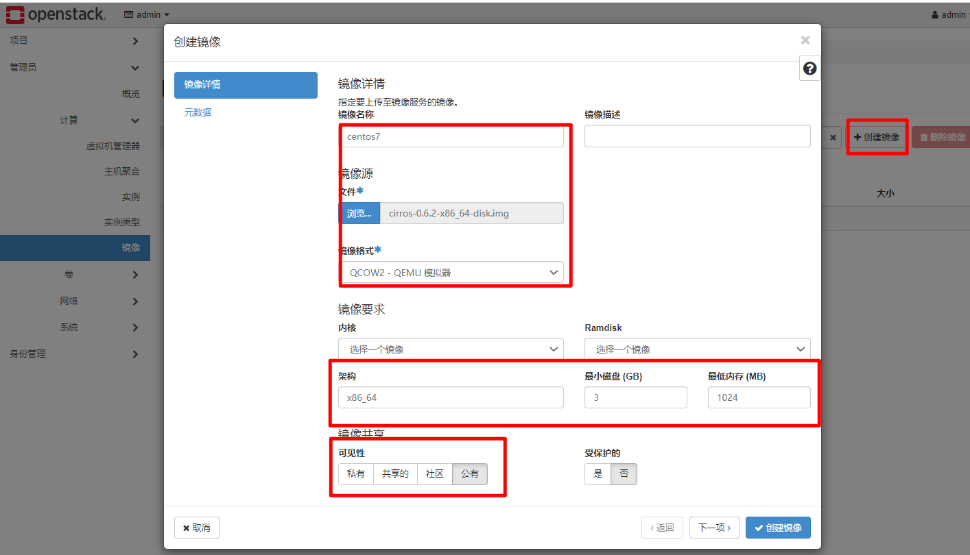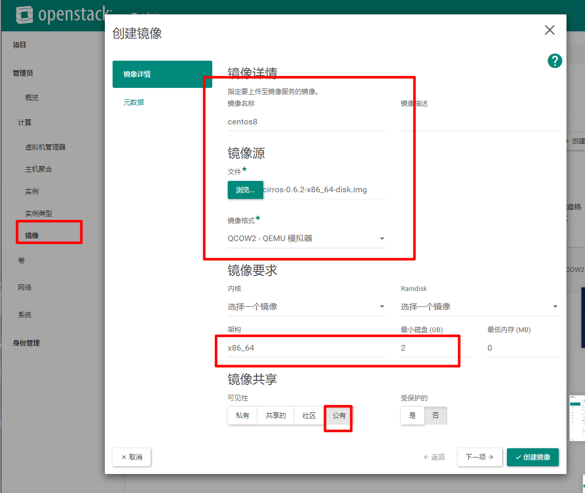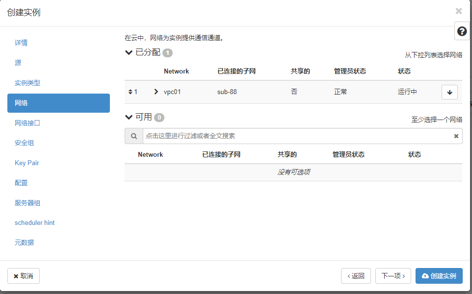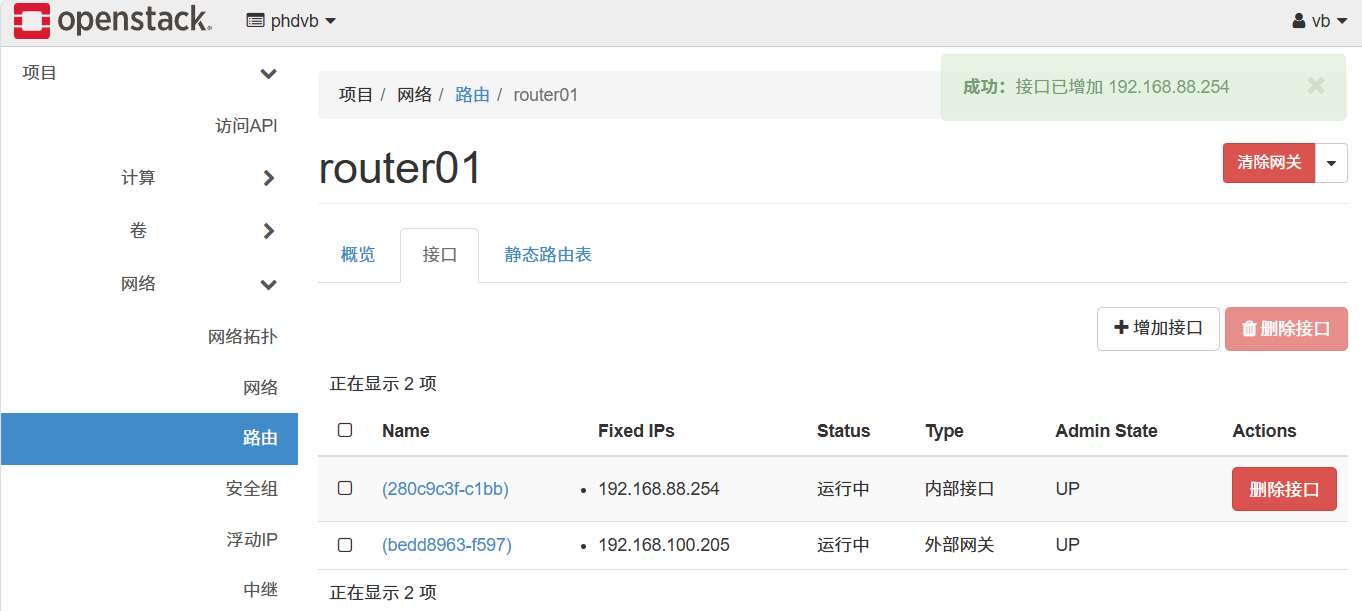 TypeScript[root@controller ~]# ifconfig br-ex: flags=4163<UP,BROADCAST,RUNNING,MULTICAST> mtu 1500 inet 192.168.100.128 netmask 255.255.255.0 broadcast 192.168.100.255 inet6 fe80::20c:29ff:feb1:47fc prefixlen 64 scopeid 0x20<link> ether 00:0c:29:b1:47:fc txqueuelen 1000 (Ethernet) RX packets 78129 bytes 219656760 (209.4 MiB) RX errors 0 dropped 0 overruns 0 frame 0 TX packets 57307 bytes 49891019 (47.5 MiB) TX errors 0 dropped 0 overruns 0 carrier 0 collisions 0 ens160: flags=4163<UP,BROADCAST,RUNNING,MULTICAST> mtu 1500 inet6 fe80::20c:29ff:feb1:47fc prefixlen 64 scopeid 0x20<link> ether 00:0c:29:b1:47:fc txqueuelen 1000 (Ethernet) RX packets 217594 bytes 243211439 (231.9 MiB) RX errors 0 dropped 0 overruns 0 frame 0 TX packets 83288 bytes 51521081 (49.1 MiB) TX errors 0 dropped 0 overruns 0 carrier 0 collisions 0 genev_sys_6081: flags=4163<UP,BROADCAST,RUNNING,MULTICAST> mtu 65000 inet6 fe80::ccce:ddff:fe9b:732c prefixlen 64 scopeid 0x20<link> ether ce:ce:dd:9b:73:2c txqueuelen 1000 (Ethernet) RX packets 0 bytes 0 (0.0 B) RX errors 0 dropped 0 overruns 0 frame 0 TX packets 0 bytes 0 (0.0 B) TX errors 0 dropped 15 overruns 0 carrier 0 collisions 0 lo: flags=73<UP,LOOPBACK,RUNNING> mtu 65536 inet 127.0.0.1 netmask 255.0.0.0 inet6 ::1 prefixlen 128 scopeid 0x10<host> loop txqueuelen 1000 (Local Loopback) RX packets 903488 bytes 227952976 (217.3 MiB) RX errors 0 dropped 0 overruns 0 frame 0 TX packets 903488 bytes 227952976 (217.3 MiB) TX errors 0 dropped 0 overruns 0 carrier 0 collisions 0管理员账号创建公网: