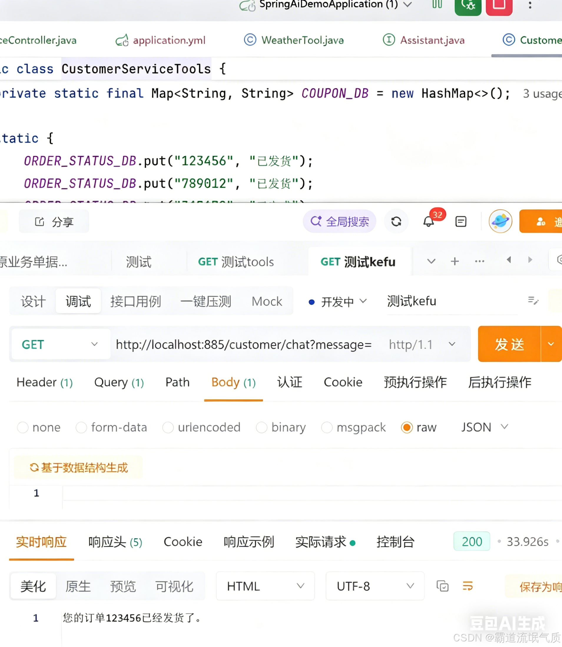curl "http://localhost:885/ai/chat?message=我的订单123456现在什么状态?