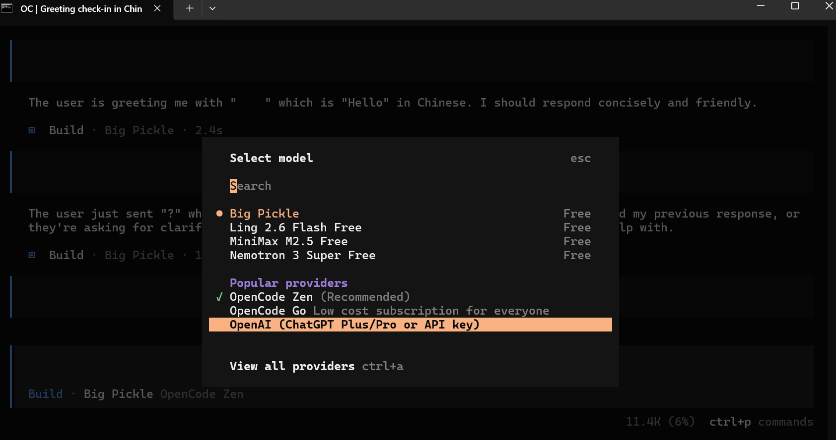 这样就可以简单使用 OpenCode,当然这只是刚刚入门,许多的更贴切读者自己的使用,不妨查查相关官方文档。