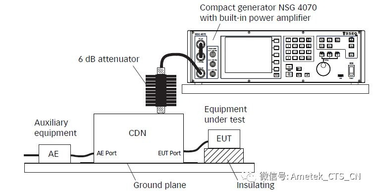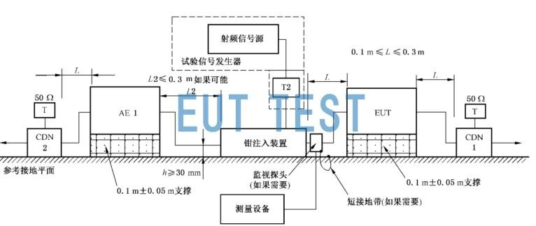 CDN 是 IEC 61000-4-6 标准规定的首选耦合装置,集成耦合与去耦双重功能,既能精准注入干扰信号,又能防止干扰倒灌污染电网或辅助设备,标准测试拓扑如下: