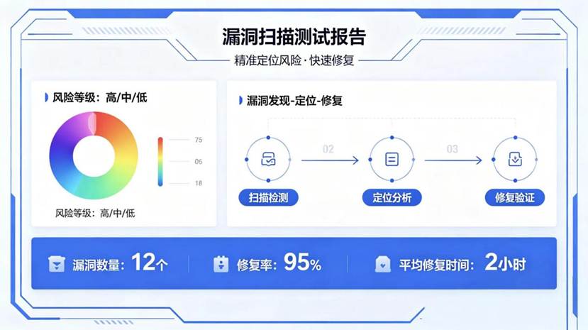 对企业来说,系统出现安全隐患,最让人头疼的两件事就是"找不到问题在哪"和"不知道怎么修"。很多企业遇到系统异常,要么花大量时间自己排查,最后一无所获;要么盲目找技术人员尝试修复,不仅没解决问题,还可能耽误时间、浪费人力物力,甚至因为漏洞没及时处理,引发数据泄露、系统瘫痪等更大损失。而一份专业漏洞检测报告,就能精准解决这两个痛点,依托专业的技术和检测工具,实现"精准定位漏洞、快速给出修复方案",帮企业高效消除安全风险,避免因漏洞排查和修复耗时过长而蒙受损失。