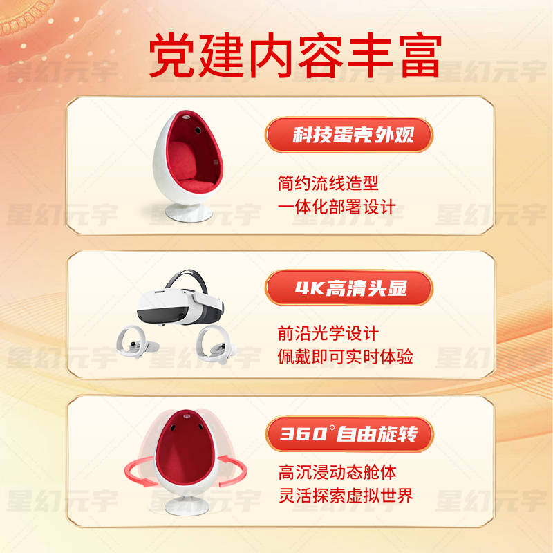 VR党建蛋椅在内容设计上,通常围绕实际党建工作需求展开,涵盖多个方向,包括但不限于: