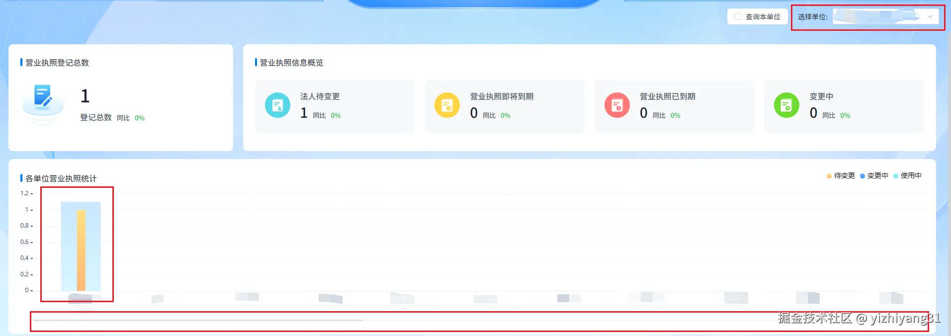 - 基础展示:清晰呈现多单位的「使用中」「变更中」「待变更」三类营业执照数量,采用堆叠柱状图,直观对比各类数据占比;