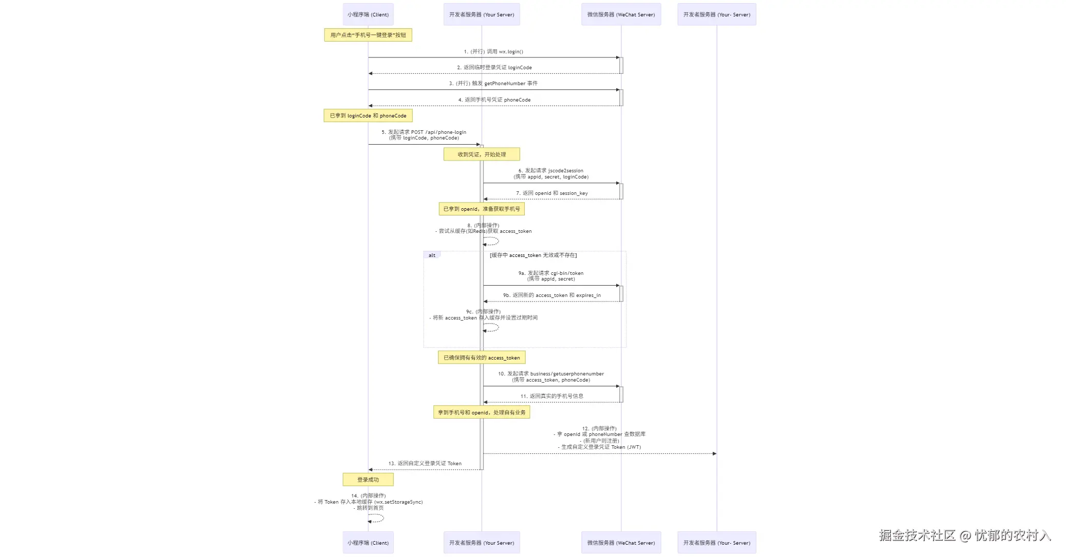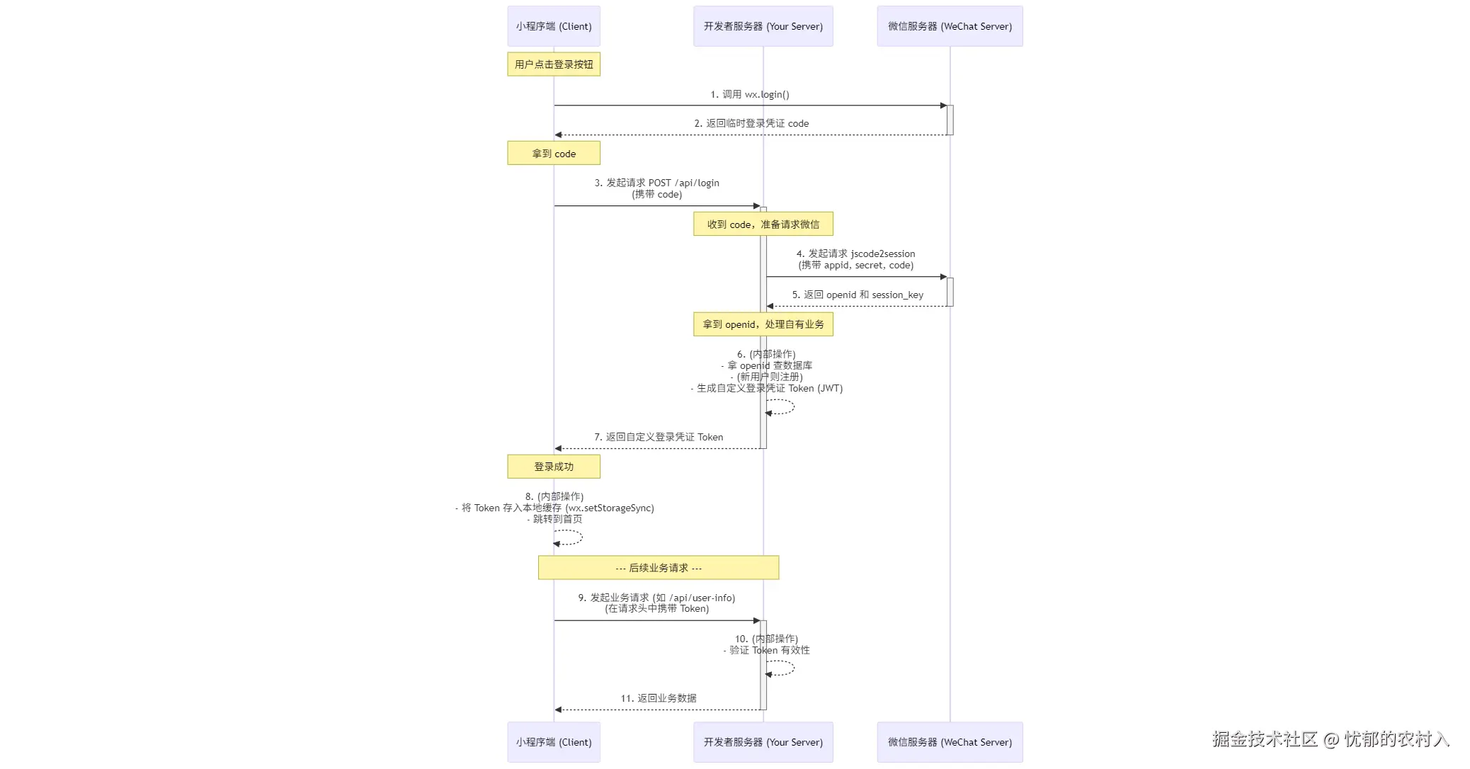 | 手机号登录 | 1. 前端 wx.getPhoneNumber()拿 phoneCode2. 后端先用 loginCode 换 openid + session_key3. 用 phoneCode + session_key解密获取手机号 4. 用 openid 查库/注册用户 5. 生成系统 token |