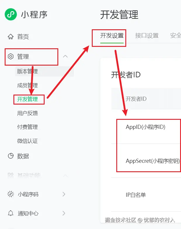 先在 微信公众平台 拿到 appId 和 secret (进入到管理,点击开发管理,点击开发设置)
