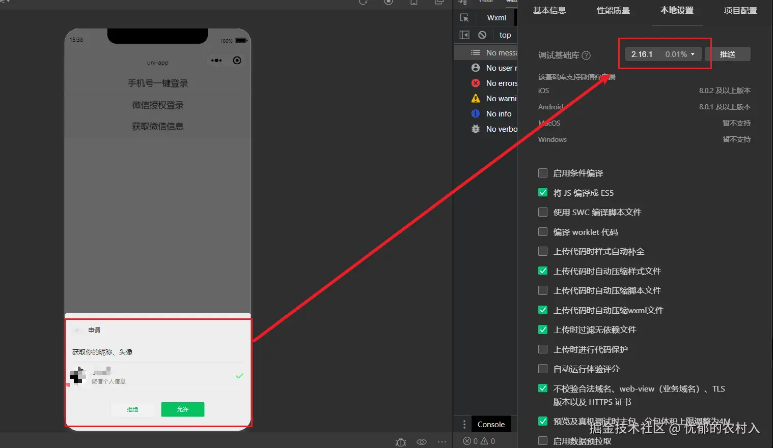 注意:调用 uni.getUserProfile 我的基础库是选择的 2.16.1 版本,目前新版本无法触发官方的弹窗,并且拿到信息也是匿名的。