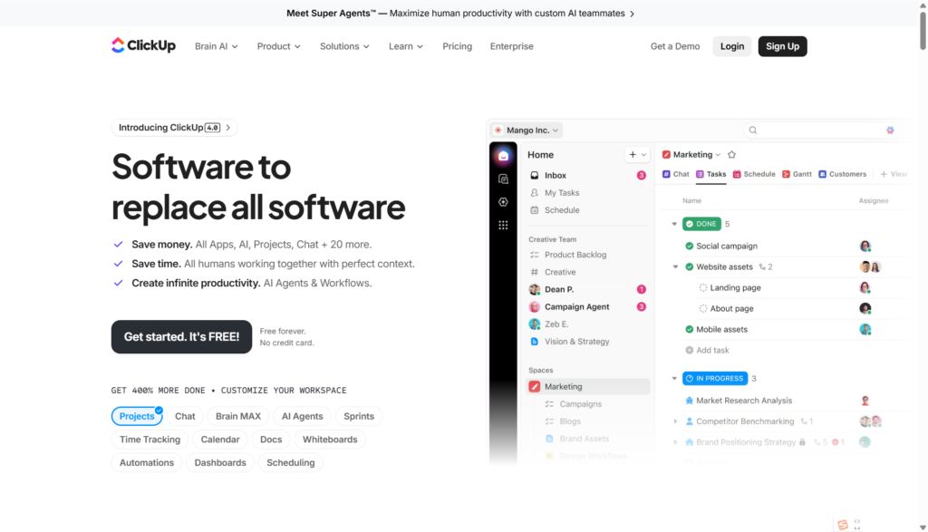 推荐理由: ClickUp 很受关注,一个重要原因就是覆盖面广。它希望用一套系统同时承接任务、项目、文档、自动化和报表。对不想堆太多工具的团队来说,会有吸引力。