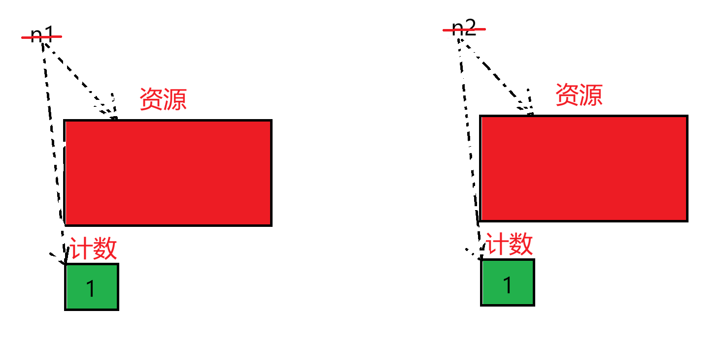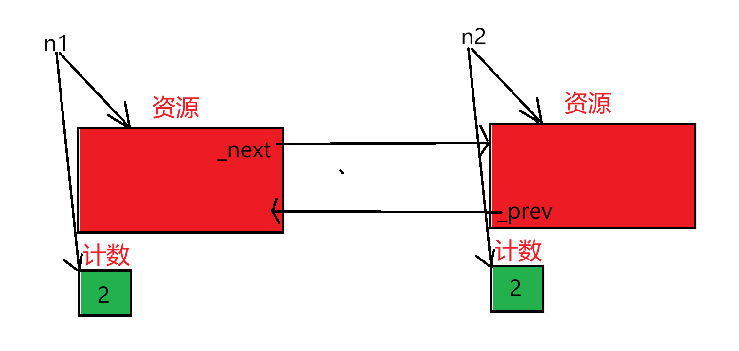 假如 n1 的资源中又有一个shared_ptr 指针 _next 指向 n2,n2 的资源中又有一个shared_ptr 指针 _prev 指向 n1。注意此时计数器的变化: