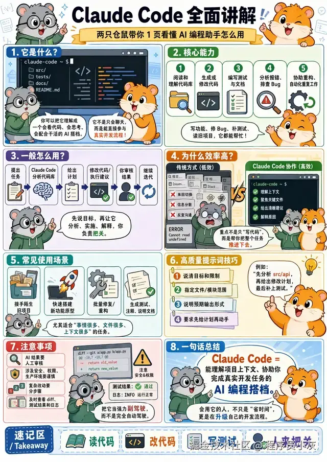 "生成一页漫画,全面讲解Claude Code,漫画的主角是两只可爱的2D卡通小仓鼠,一只灰色,一只橙色。"