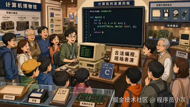 "在计算机博物馆里,一个程序员在展厅中央,正在演示C语言编程,很多参观者在围观,屏幕上的代码清晰可见。旁边的牌子写着:"古法编程,现场表演"。2D卡通画风,16:9"