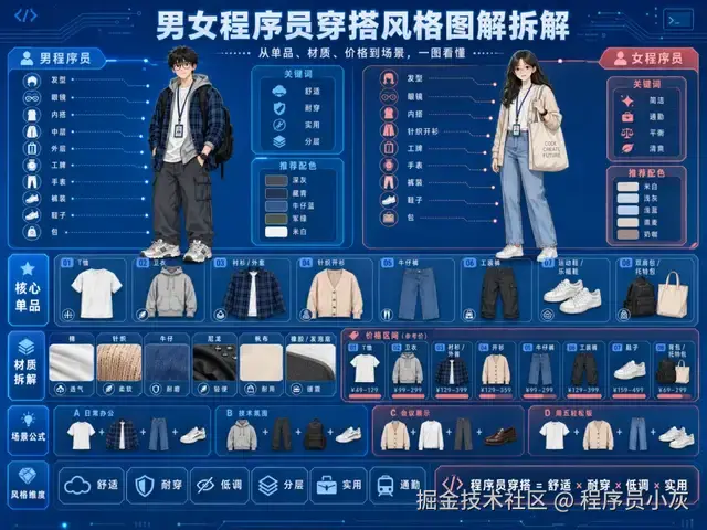 "用一张图拆解男程序员的穿搭风格,从物件名称,材质,价格等多个维度详细拆解,少用文字,多用图表达。"