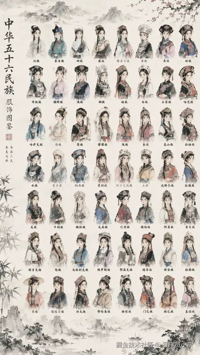 "在一张图里展现中国56个民族的全身服饰,新中式水墨风,9:16"