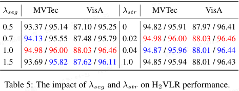 特殊损失参数:表 5 显示 λseg=1.0 和 λstr=0.02 时最优。