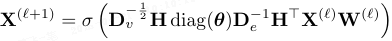 其中 θ 为语义引导超边构建时诱导的超边权重,W(ℓ) 为可学习投影矩阵,σ(⋅) 为非线形激活。
