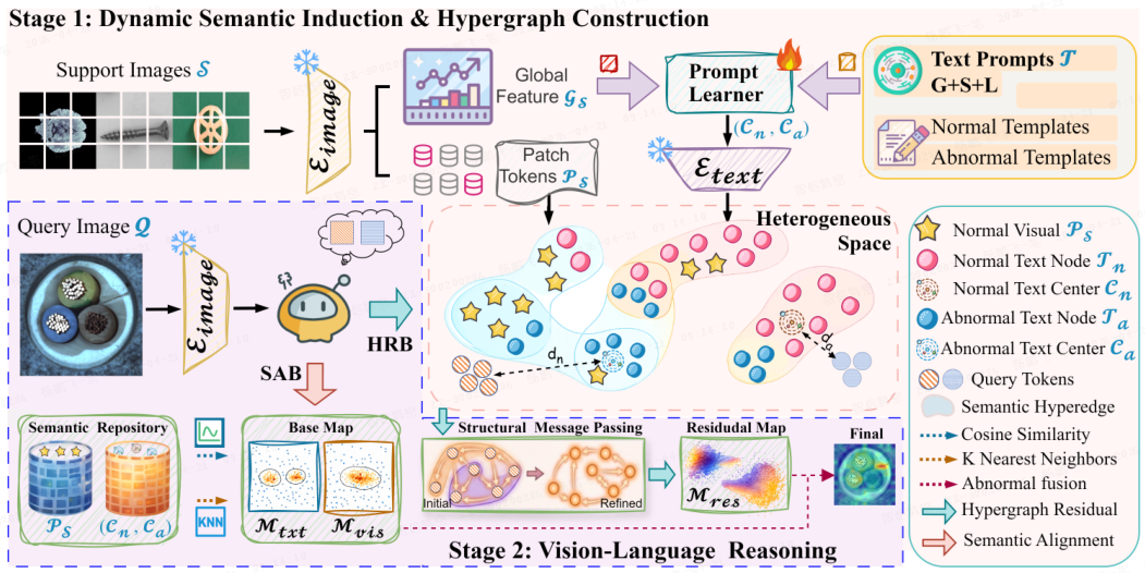 - 超越传统成对匹配,提出 H₂VLR,一种用于小样本异常检测的异质超图视觉-语言推理框架。