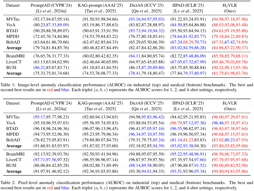 - H₂VLR 在多数情况下超越其他方法,例如 4-shot 下 MVTec I-AUC 97.96%,BUSI 93.38%;BrainMRI P-AUC 97.32%。