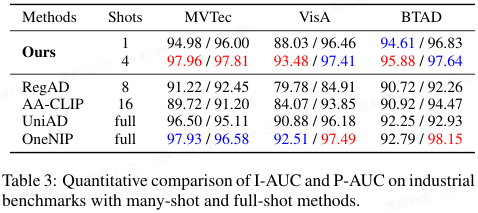 - 与更多样本及全样本方法对比见表 3,H₂VLR 的 1-shot 性能甚至超越 RegAD(8-shot)和 AA-CLIP(16-shot),4-shot 超越全样本的 OneNIP。