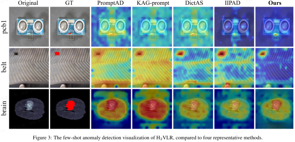 可视化比较:图 3 显示 H₂VLR 在多个数据集上取得更精确、更少噪声的异常检测与定位结果,与定量结果一致。