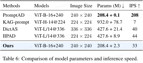 参数与推理速度:表 6 显示 H₂VLR 仅增加 2.3M 可学习参数(总计 210.7 M),推理速度 33 images/s,虽低于 PromptAD 但远高于 KAG-prompt,在检测性能上达 SOTA。