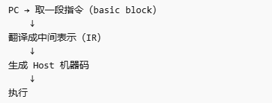 这里只是举个例子,qemu内部实际使用的是性能更高的解决方案:TCG,这个技术有点类似Java虚拟机JVM的模板解释器或即时编译JIT,上面的伪代码类似JVM的字节码解释器