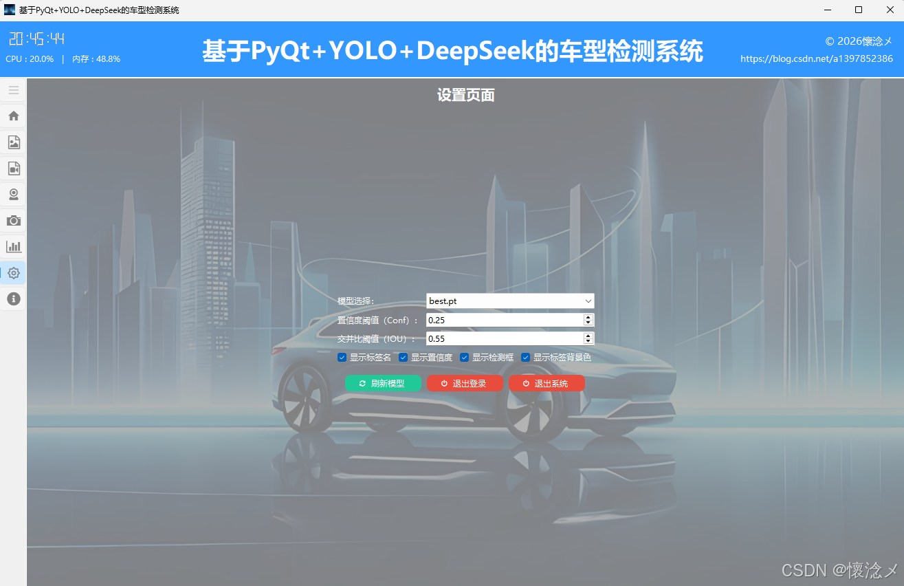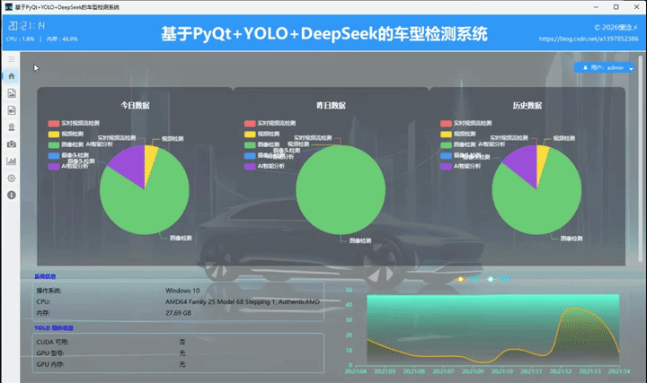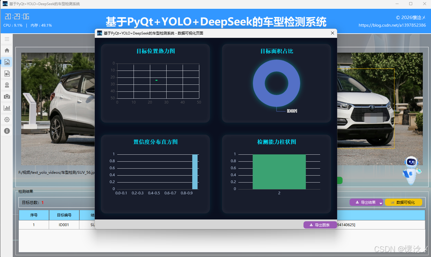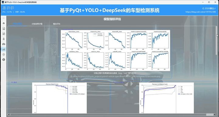 本次给大家介绍了我使用PyQt5+YOLOv8+DeepSeek的车型检测系统,本系统功能强大,支持多种数据源输入,包含多种用户交互按钮以及模式,内置数据可视化方案、大模型AI加持,是您学习、工作使用的不错选择!