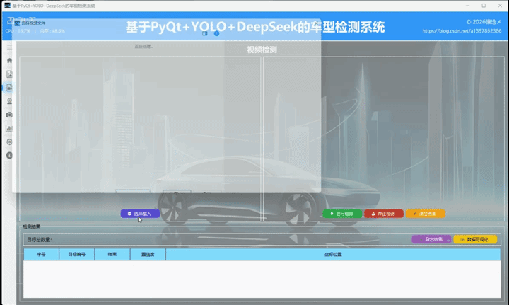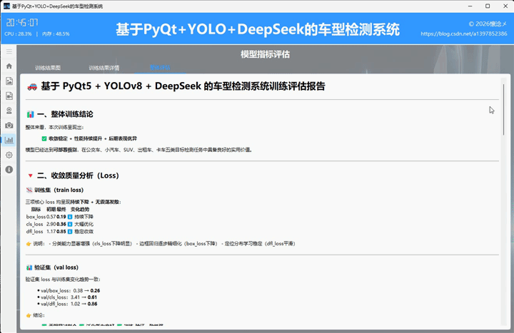 与此同时,计算机视觉技术在深度学习的推动下取得了显著进展,尤其是以YOLOv8为代表的目标检测模型,在实时性与检测精度方面表现突出,能够高效识别多种车型目标;PyQt5在桌面应用开发领域成熟稳定,为系统提供了良好的图形化交互界面和清晰的业务逻辑组织方式,使得系统具备较强的可用性与扩展性;而DeepSeek类语言模型的引入,使系统在检测结果分析、异常情况解释以及自动生成统计报告和智能参数调优等方面具备更高层次的智能化能力。三者的融合,使车型检测从单一的视频识别功能,升级为集检测、分析、交互与智能辅助于一体的综合系统。
