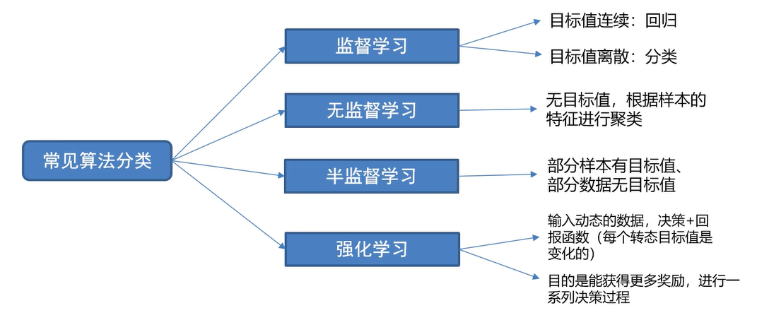 算法分类:①有监督学习即有特征有标签、②无监督学习即有特征无标签、③半监督学习即部分内容打标记,让程序基于打过标记的数据进行训练、④强化信息严格意义上不属于机器学习,属于深度学习,但深度学习可理解为机器学习的分支。