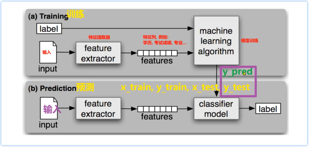 (图示:上部分是模型训练Training,下部分是模型预测Prediction;有标签label,input输入数据(训练集),通过特征提取器feature extractor提取特征,在特征列features中,如学历、考试成绩、专业等,从input数据中提取出来的特征;machine learning algorithm模型训练;下部分预测Prediction,input输入测试集,通过特征提取器feature extractor提取特征features,经过模型classifier model公式算法,最终有了一个预测标签label;即最终的结果都是为了这个值label标签,所以这个叫做有监督学习:有特征features、有标签label;)
