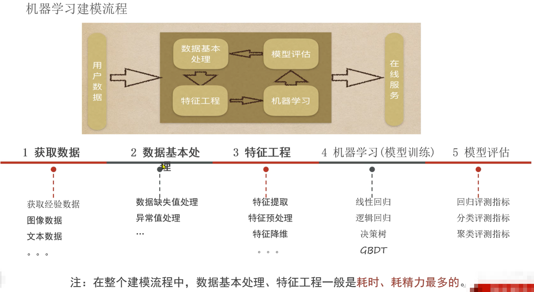 下部分:五大步:①获取数据即获取经验数据,如图像数据、文本数据、音频数据、视频数据等;②数据的基本处理,如缺失值处理、异常值处理,如RFM案例中对缺失值的处理一般就2个方案:要么删除 要么填充,对于数据量大,缺失值比较少 的时候进行删除,对于填充,填充的是中位数、平均值等;对于异常值:RFM案例中如消费金额(订单金额)在1元以下的认为是刷单,这种数据进行过滤;如果要处理一些复杂的业务,数据集中没有这些字段,可以让A列帮忙生成一个B列;这些都可以叫数据的基本处理;③特征工程:又分为特征提取,如在文本文件或者数据中提取出来一些特征列,这叫提取;特征的预处理是防止量纲不同导致数据结果有差异,量纲即权重;特征降维即将数据从三个特征降为两个特征,如将图像从3D(三维)图像降为2D(二维)图像;特征选取与特征提取不同,提取是提取特征,选取是选出最终要用的;最后是特征组合;④模型训练,如线性回归、逻辑回归、决策树、GBDT(梯度提升决策树);⑤模型评估:回归评测指标即回归模型的评估指标是啥、分类的、聚类的评估指标分别是啥,即不同模型的评估指标不同;)