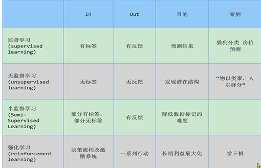 有监督学习、无监督学习、半监督学习、强化学习;