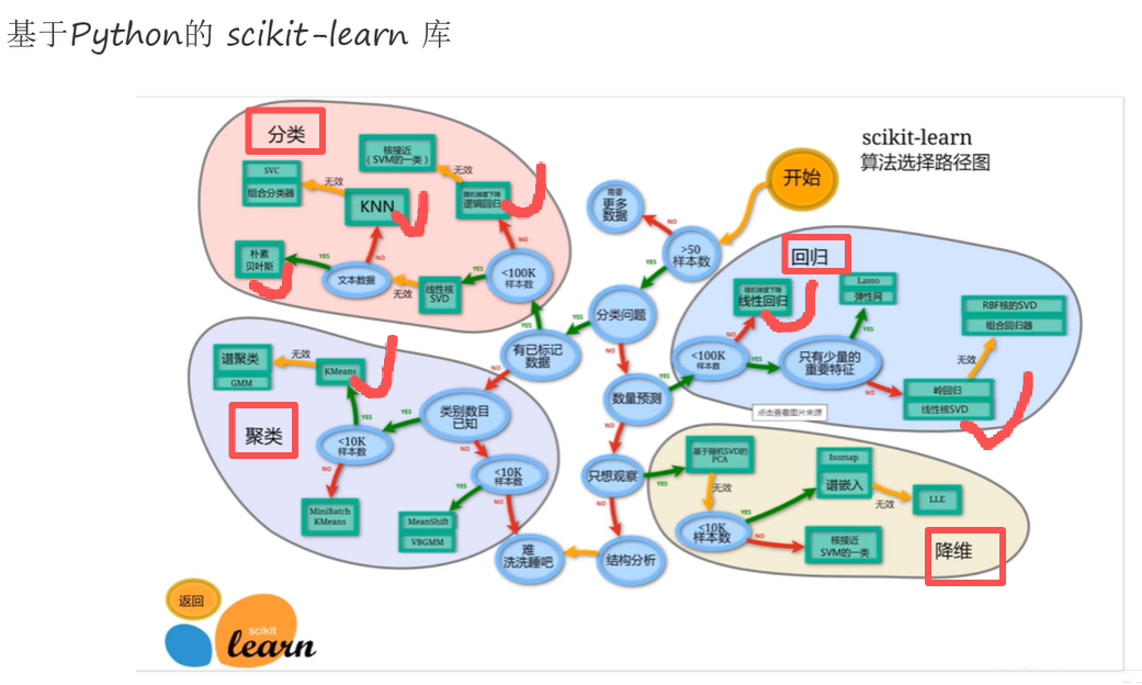 (图示 :机器学习的算法选择路径:主要三大类(图中4块):分类、回归、聚类、降维一般适用于数据较多的情况,用的少;