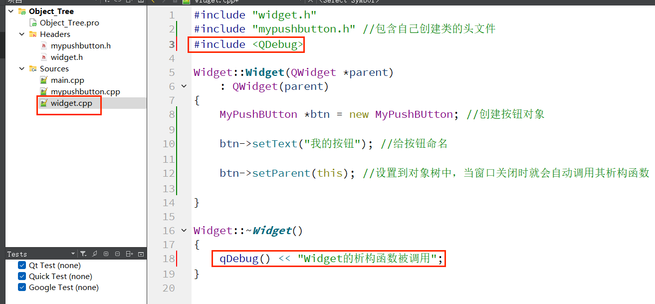 任何对象树中的 QObject 对象 delete 的时候,如果这个对象有 parent,则自动将其从 parent 的 children() 列表中删除;如果有孩子,则自动 delete 每一个孩子。Qt 保证没有 QObject 会被 delete 两次,这是由析构顺序决定的。