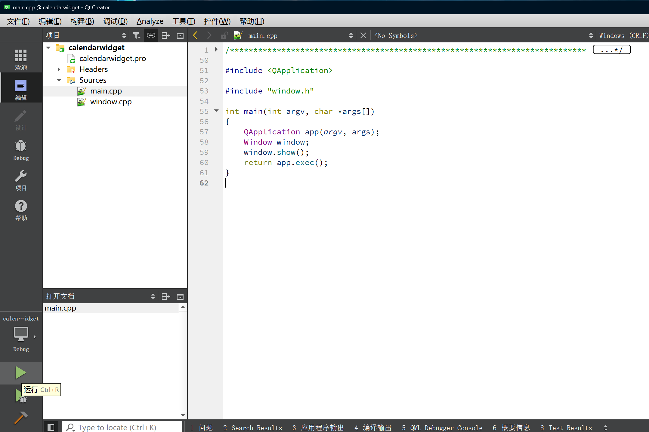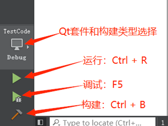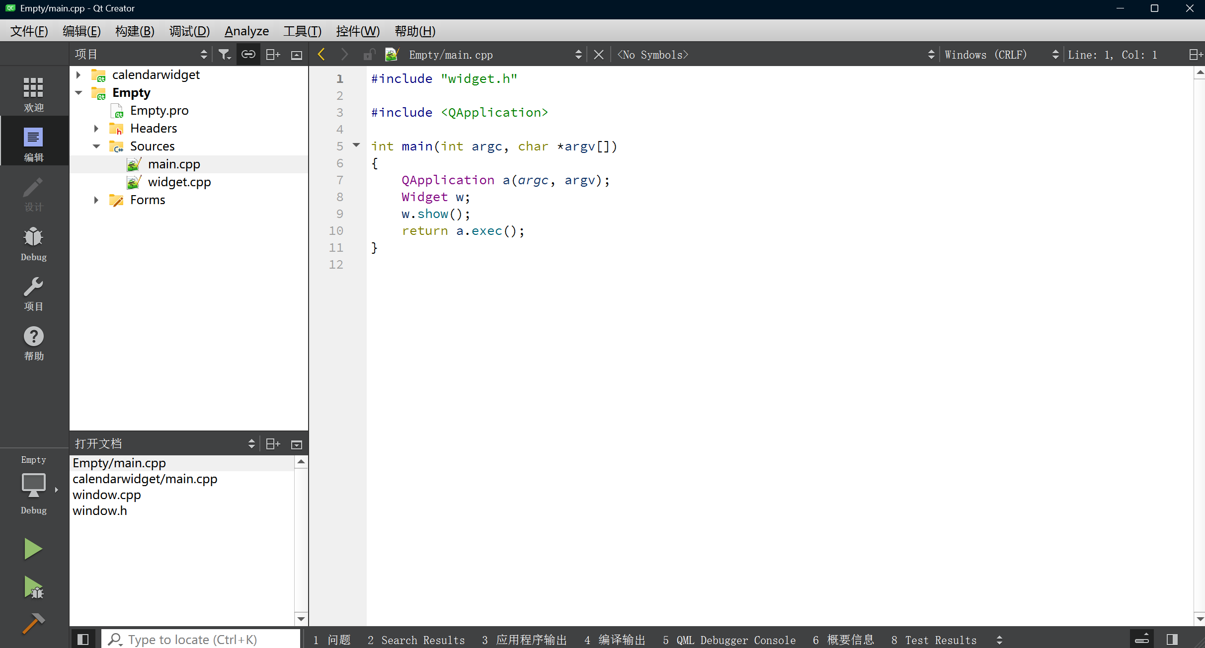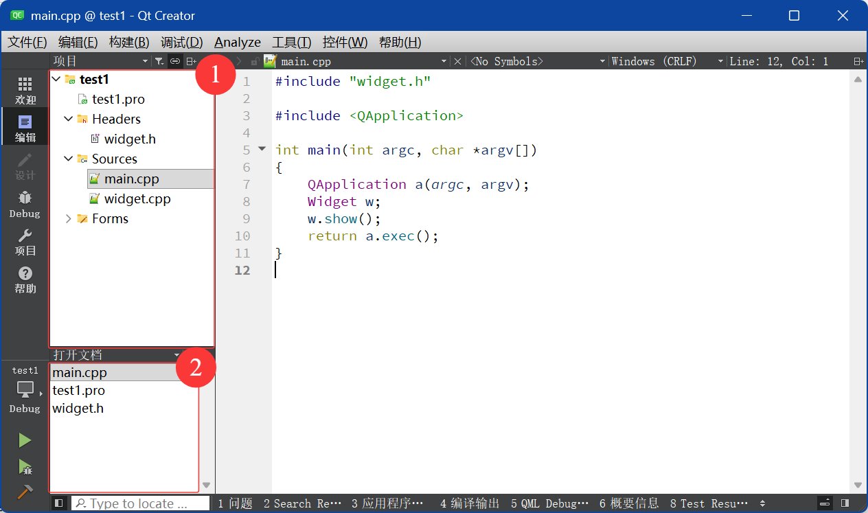 文件 包含了新建、打开、关闭项目和文件、打印和退出等基本功能 编辑 包含了撤销、剪切、复制、查找和选择编码等功能 构建 包含构建和运行项目等相关功能 调试 包含调试运行项目等相关功能 Analyze 包含 QML 分析器、Valgrind 内存和功能分析器等相关功能 工具 提供了快速定位菜单、外部工具菜单等。这里的选项菜单中包含了 Qt Creator 各个方面的设置选项:环境设置、文本编辑器设置、帮助设置、构建和运行设置、调试器设置和版本控制设置等 控件 包含了设置窗口布局的一些菜单,如全屏显示和隐藏边栏功能等 帮助 包含 Qt 帮助、Qt Creator 版本信息、报告bug和插件管理等菜单 -