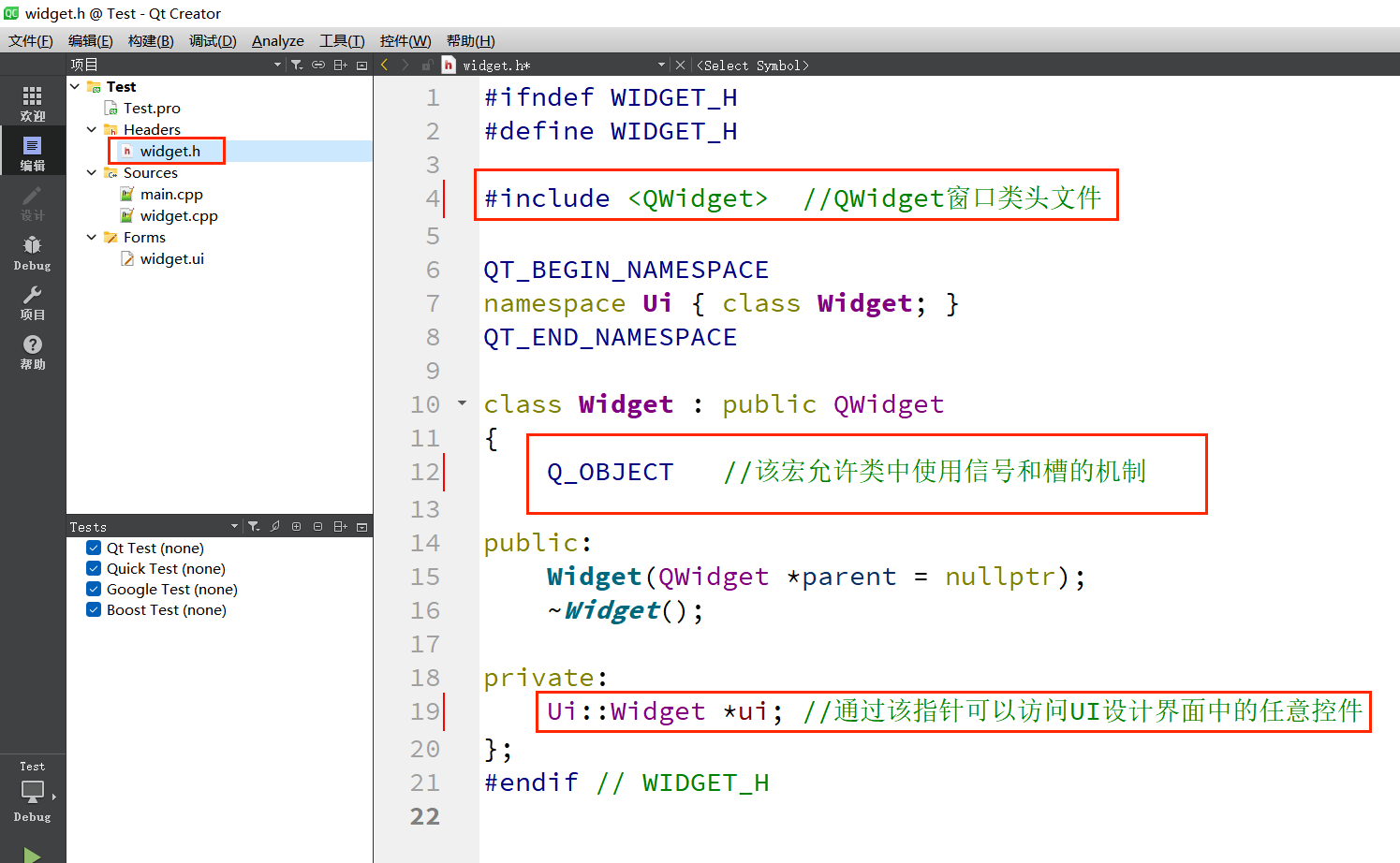 widget.ui 是窗体界面定义文件,是一个 XML 文件,定义了窗口上的所有组件的属性设置、布局,及其信号与槽函数的关联等。用 UI 设计器可视化设计的界面都由 Qt 自动解析,并以 XML 文件的形式保存下来。在设计界面时,只需在 UI 设计器里进行可视化设计即可,而不用管 widget.ui 文件是怎么生成的。