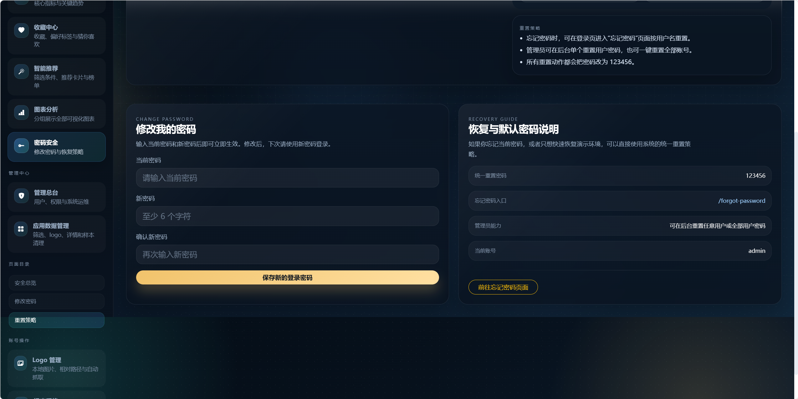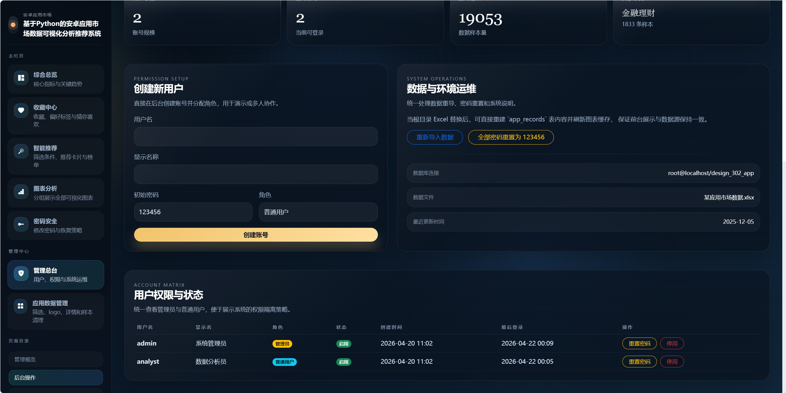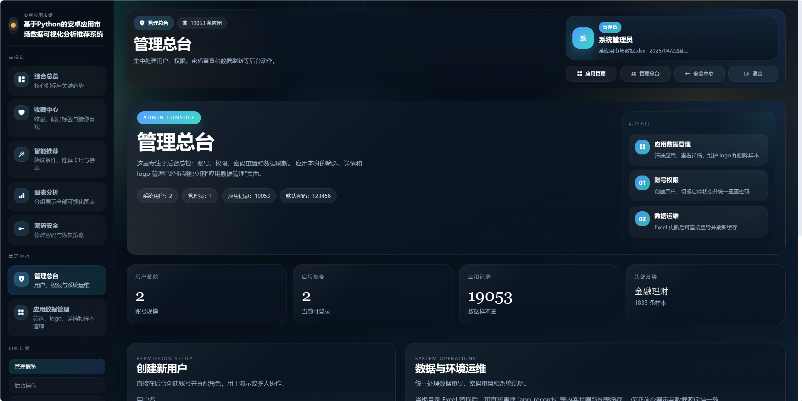 - 提供管理员与普通用户两类权限,并支持账号维护、应用数据维护和数据刷新。